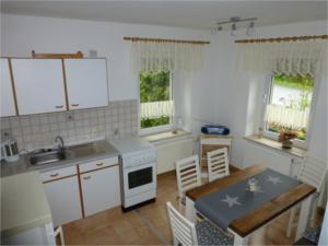 Eine komplett ausgestattete Wohnküche erwartet Sie in unserer Ferienwohnung. Mit Tisch und Stühlen ist eine gemütliche Wohnatmosphäre gegeben. Ein vierflammiger Gasherd mit Backofen, Kaffemaschine, Toaster, Wasserkocher, Kühlgefrierkombination ermöglichen eine problemlose Selbsersorgung. Auch ein Babyhochstuhl für die Kleinsten ist vorhanden.