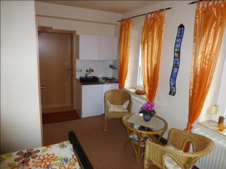 Unser Doppelbettzimer ist mit einer Zweiersitzgruppe und einer Miniküche ausgestattet. Diese beinhaltet ein Zweiplattenherd, Kühlschrank mit Gefrierfach, Kaffemaschine, Toaster, Wasserkocher sowie Töpfe und Geschirr.